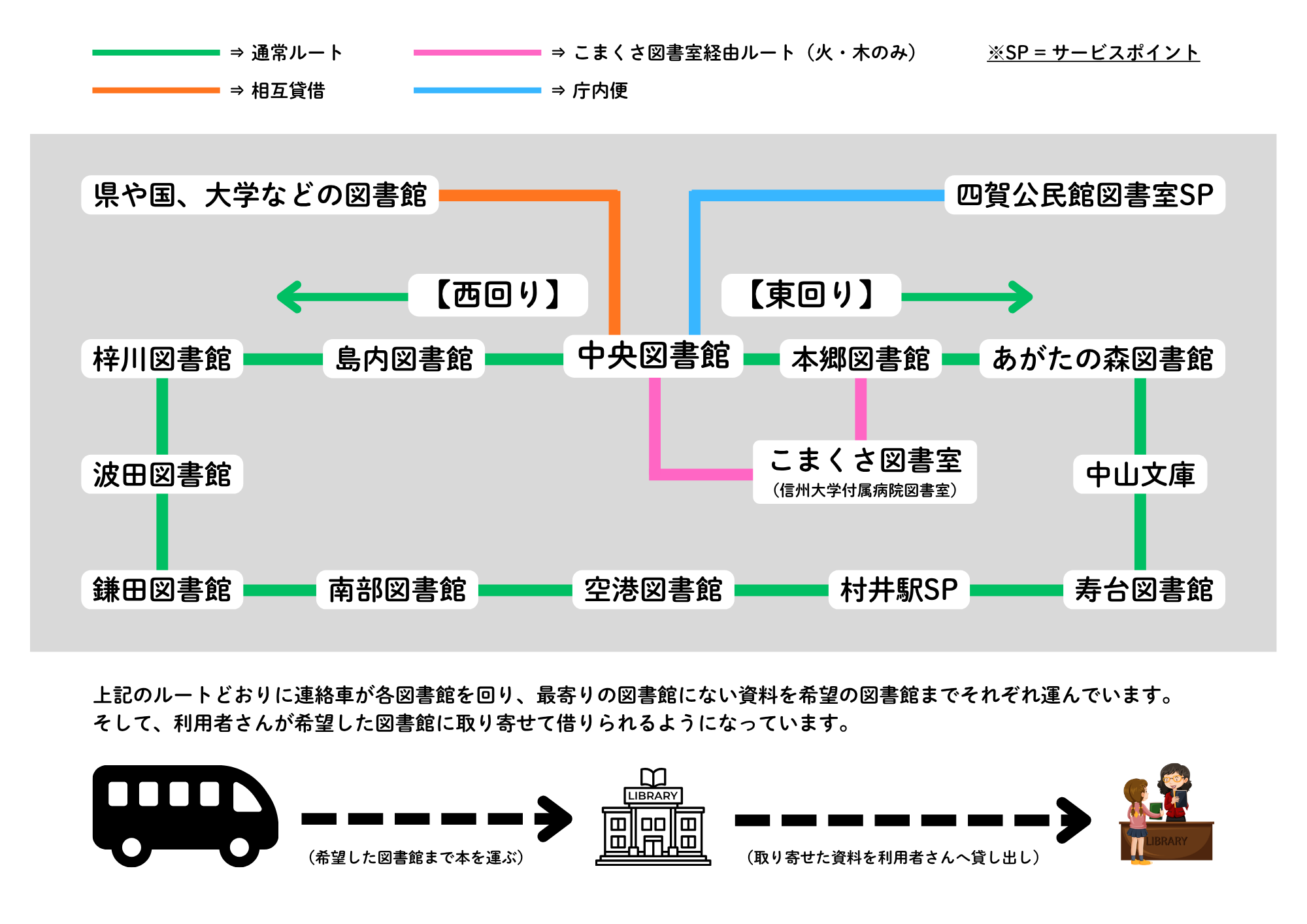 市民のみなさまは、どこでも身近な図書館で、図書資料の貸出、返却ができるほか、お近くの図書館にない図書資料でも、検索により所蔵のある図書館から連絡車で希望の図書館に取り寄せて借りていただくことができます。