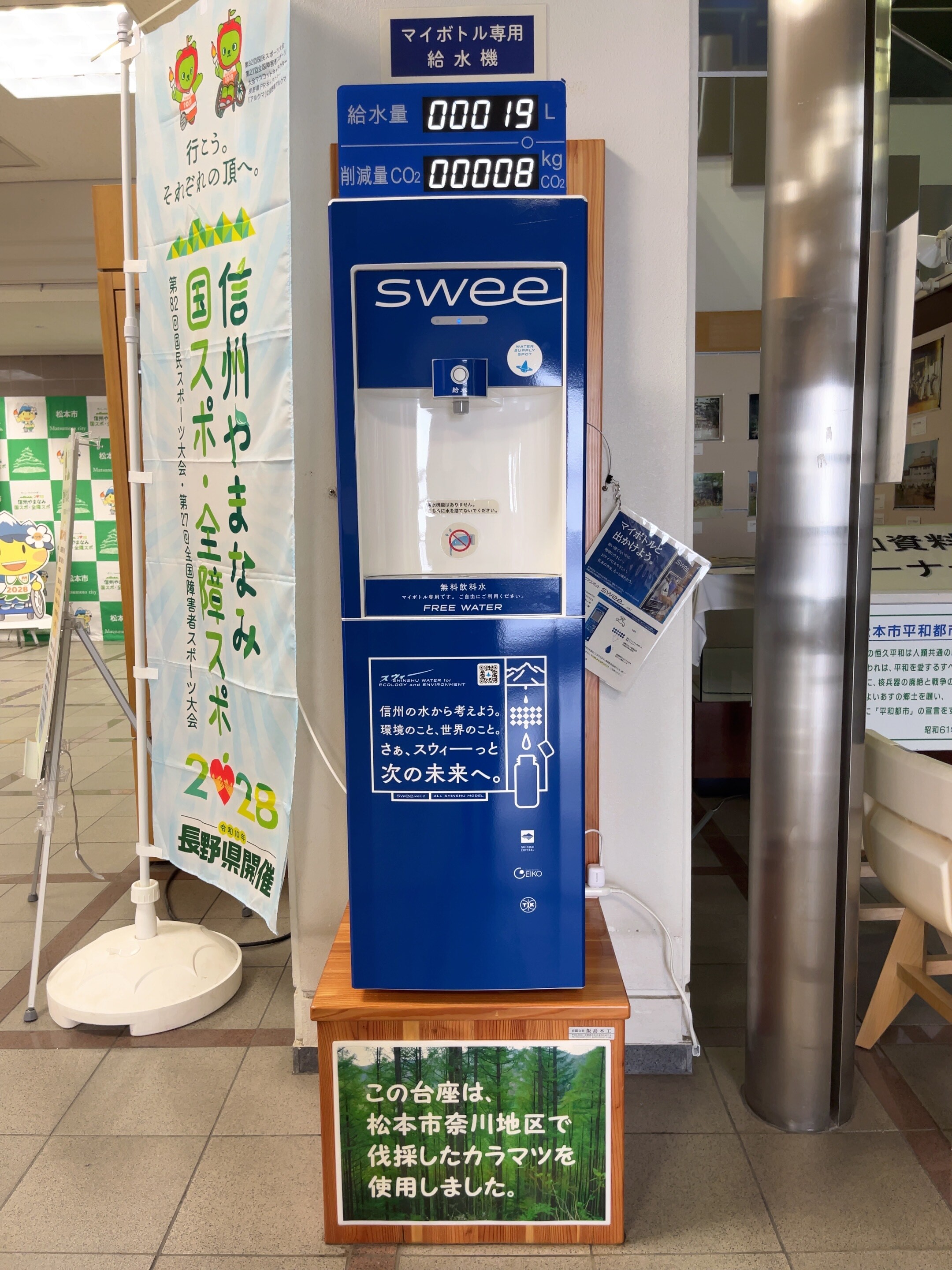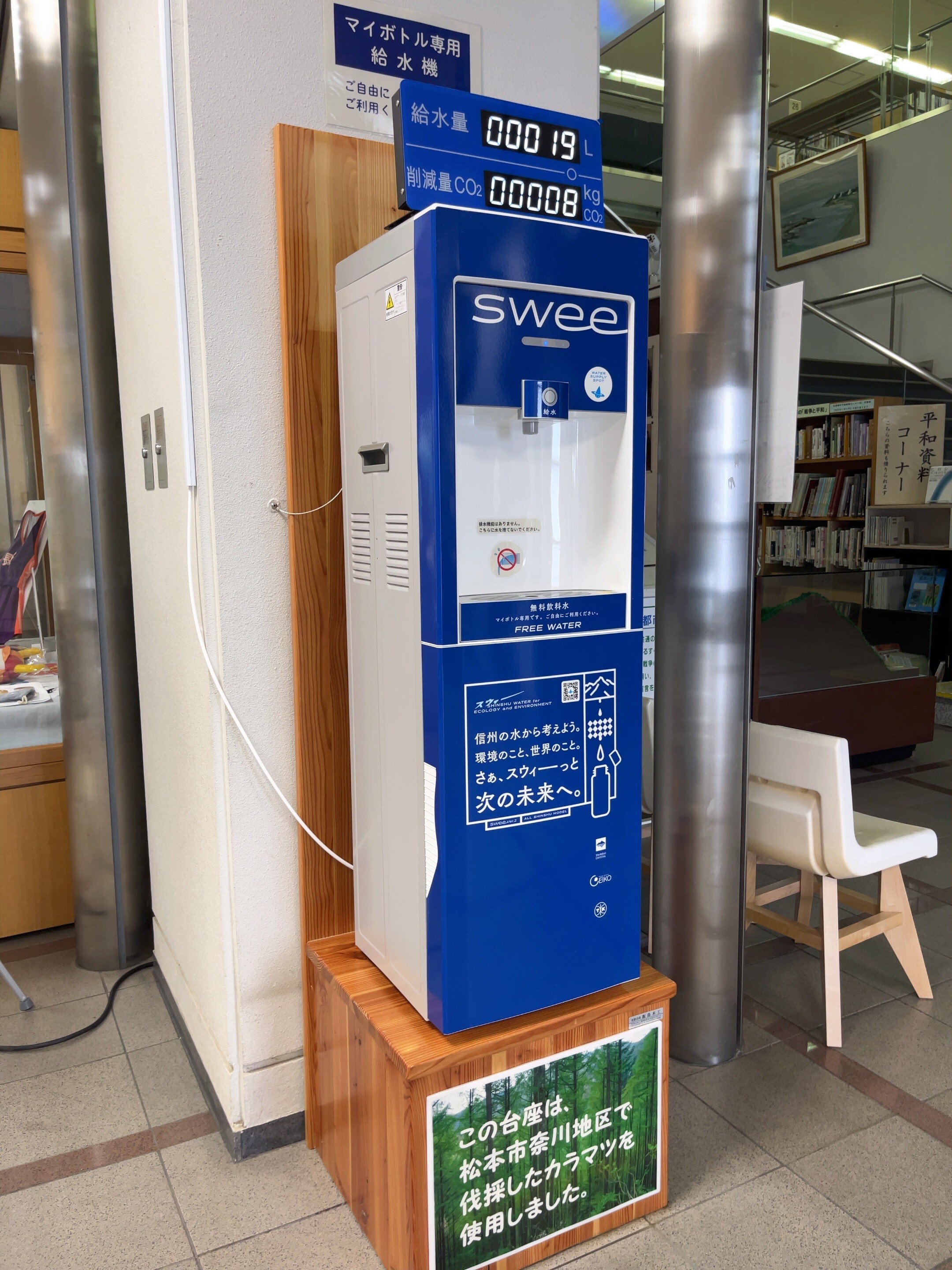 プラスチックごみ削減による環境負荷の低減、SDGsへの貢献のため、信州大学と協働により、マイボトルの活用を促すマイボトル専用給水機「アクアスポットswee」を中央図書館1階ロビーに設置しましたのでご利用ください。