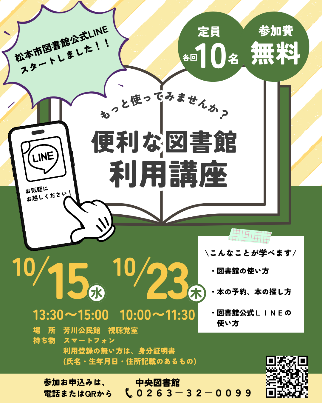 申込みフォーム(別ウインドウで開く)、または電話(0263-32-0099)、FAX(0263-37-1148)にて中央図書館へ